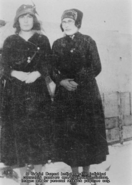 | Description: | Photograph of Leona Landry’s aunts taken outdoors in the snow in front of a fence. They are wearing heavy coats and hats. Flora Landry is the woman wearing the glasses, and the other woman’s name is unknown. |