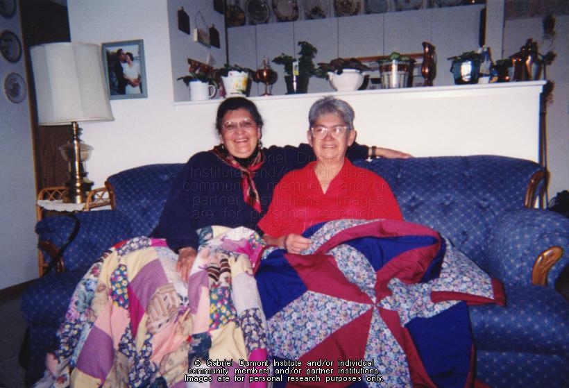 | Description: | Photograph of Maria Campbell and Billie Robison (Welsh), with quilts. These quilts belong to Billie Robison. |