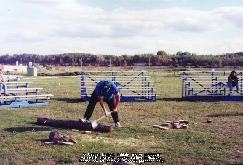 | Description: | Photograph of a man chopping a log during the King Trappper Event at the Prince Albert Métis Fall Festival. |