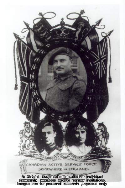| Description: | Photograph of David Dumont set in frame with "Canadian Active Service Force, Somewhere in England" on it. Davidʼs story can be found in "Remembrances: Interviews With Metis Veterans". To purchase Métis Veterans: Remembrances please visit: GDIʼs E-commerce Site.