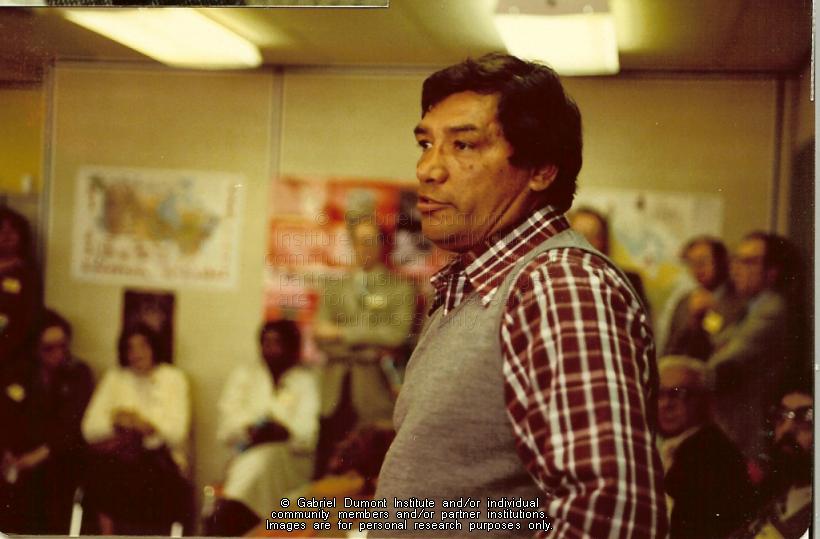 This photograph is the official signing ceremony for the Gabriel Dumont Institute in Regina in 1980. In the picture, President of the Association of Métis and Non-Status Indians of Saskatchewan is speaking. |