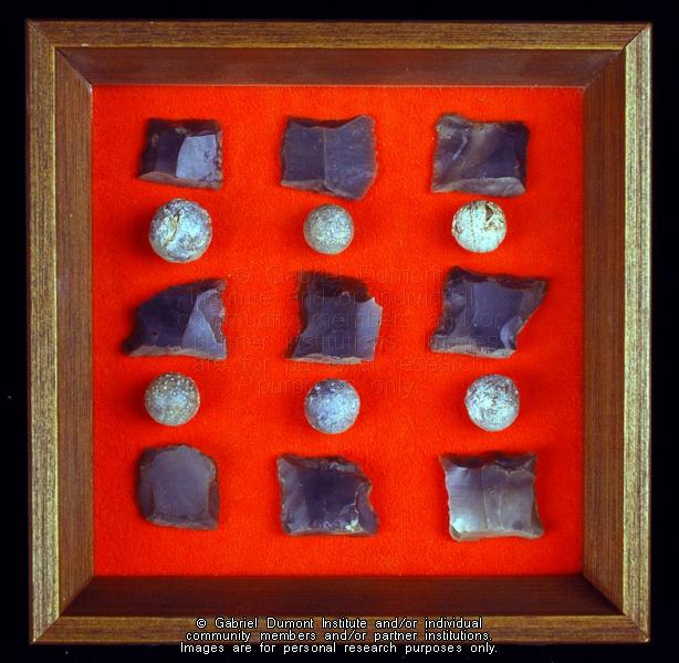 | Description: | This image (by Peter Beszterda) is of a 6`` x 6`` vertical display of flints and lead musket balls used during the 1885 Resistance. They were collected by Dennis and Jean Fisher and their sons in late 1960s or early 1970s. They are part of the Dennis and Jean Fisher Collection. This collection contains archaeological artifacts taken from the battlefields of the 1885 Resistance as well as Fort Pitt (Saskatchewan), Cumberland House (Saskatchewan) and St. Peter’s Mission, Montana. The collection also includes various artifacts and ephemera relating to the 1885 Resistance and Gabriel Dumont. |