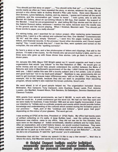 | Description: | This image is of Dennis Fisher`s note for the content of the Gabriel Dumont album. In 1999, Dennis Fisher put together this album and entitled it the ``Gabriel Dumont Album.`` The album largely focuses on items relating to Gabriel Dumont such as Dennis and Bill Epp`s correspondence regarding the creation of the Gabriel Dumont statue, Dennis`s finding of a ``lost`` image of Gabriel Dumont at the Buffalo Bill Cody Museum in Wyoming, information relating to an image of Dumont in a Wild West show program; a document in which Dumont attempts to write his name, a chronology of Dumont`s life, a program relating to the closing of Gabriel`s Ferry, various images relating the Commemorate `85 Celebrations in Saskatoon which honoured Gabriel Dumont, as well as facsimiles of Dumont`s stamp, and a pamphlet by Agriculture Canada promoting ``Dumont Oats.`` Other items relate to Madeleine Dumont`s grave in Montana as well as information about Louis Riel including a timeline of his life, and information relating to the acquisition of his diary by Dennis Fisher and Eugène Rhéaume.