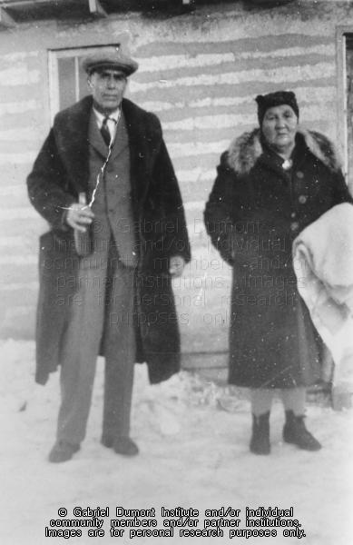 Photograph of Alec and Adele Flamont posed in front of a house at Crooked Lake. They are wearing heavy winter coats and she is holding a blanket and he is holding a bottle. Alec is wearing a suit and tie under his coat. |