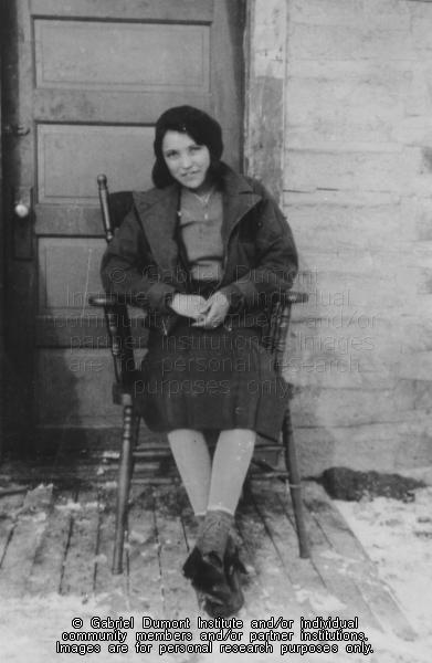 | Description: | Photograph of Eva nee Bouvier (Lafferty) sitting on a wooden chair in front of a wood plank house. She is wearing a skirt and a jacket. |