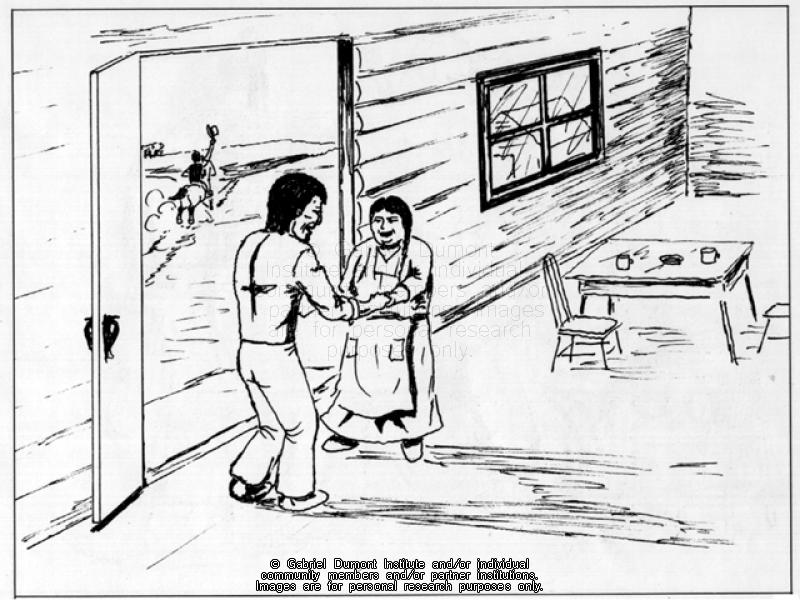 | Description: | Illustration, of a Métis man and women in cabin, by Peter Myo for the book "A Métis Wedding". |