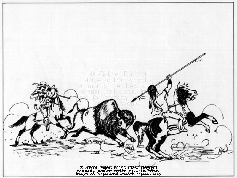 | Description: | Illustration, of men on a buffalo hunt, by Peter Myo for the book "A Métis Wedding". |