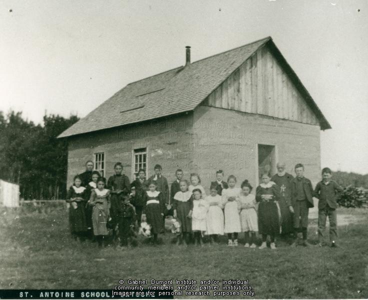 Photograph of Métis school children taken in 1900 in front of the St. Antoine School, Batoche in 1900. The photographer may have been Father Louis Cochin (Photocopy) Back Row L to R: Miss O. Dorval (Teacher), Eliza Dumont, Henri Pilon, Albert Caron, Eugene Letendre, Emma St. Denis, Raoul St. Denis, Father Moulin, Rene St. Denis, Moise Gervaise Front Row L to R: Mrs. J.B. Ranger, Mrs. Marie Parenteau, Mrs. Arthur Lepine, Charles Pilon, Mrs. Emma Dumoulin, Mrs. Agnes Grizaud, Esther St. Denis, Victorine Racette, Olivine Racette, Marguerite St. Denis, Mrs. Emilie Racette |