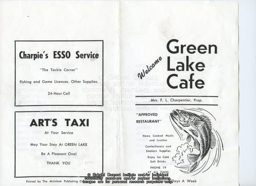 | Description: | First page of the Green Lake Cafe menu. This image is to be used for research purposes only. The reproduction of this image in whole or in part is strictly prohibited without the permission of the copyright holder. Copyright for this image belongs to Lawrence Arnault, and/or the person(s) in the photograph, and/or their descendants. |