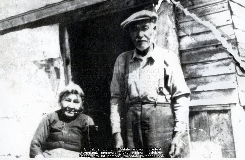 Jeremie Caisse with his wife Anna Ross. Jeremie was the son of Charles Caisse and Mary Sinclair of Ile a la Crosse, SK. Anna was the daugther of Pierre Ross of Canoe Lake. This image is to be used for research purposes only. The reproduction of this image in whole or in part is strictly prohibited without the permission of the copyright holder. Copyright for this image belongs to Lawrence Arnault, and/or the person(s) in the photograph, and/or their descendants. |