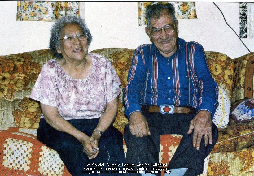 Agnes and Harry Desjarlais of Flying Dust First Nation. This image is to be used for research purposes only. The reproduction of this image in whole or in part is strictly prohibited without the permission of the copyright holder. Copyright for this image belongs to Lawrence Arnault, and/or the person(s) in the photograph, and/or their descendants. |
