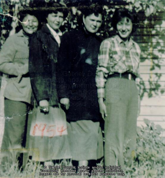 Left to right: Cecile (nee Merasty) Eagleman, Alma Bear, Florance Bear and Irene Derocher. This image is to be used for research purposes only. The reproduction of this image in whole or in part is strictly prohibited without the permission of the copyright holder. Copyright for this image belongs to Lawrence Arnault, and/or the person(s) in the photograph, and/or their descendants. |