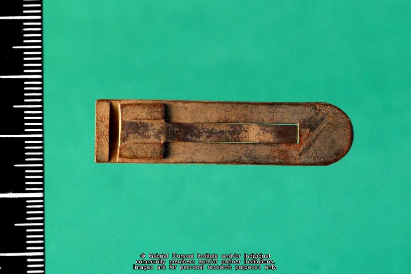 Description: This image (by Peter Beszterda) is of a concertina reed. It was collected by Dennis and Jean Fisher and their sons in the late 1960s or early 1970s from Batoche. It is part of the Dennis and Jean Fisher Collection. This collection contains archaeological artifacts taken from the battlefields of the 1885 Resistance as well as Fort Pitt (Saskatchewan), Cumberland House (Saskatchewan) and St. Peter’s Mission, Montana. The collection also includes various artifacts and ephemera relating to the 1885 Resistance and Gabriel Dumont.