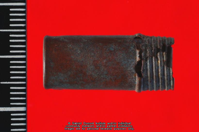 Description: This image (by Peter Beszterda) is of a copper tube from a Thoren's Music Box or Phonograph. It was collected by Dennis and Jean Fisher and their sons in the late 1960s or early 1970s from Batoche. It is part of the Dennis and Jean Fisher Collection. This collection contains archaeological artifacts taken from the battlefields of the 1885 Resistance as well as Fort Pitt (Saskatchewan), Cumberland House (Saskatchewan) and St. Peter’s Mission, Montana. The collection also includes various artifacts and ephemera relating to the 1885 Resistance and Gabriel Dumont.
