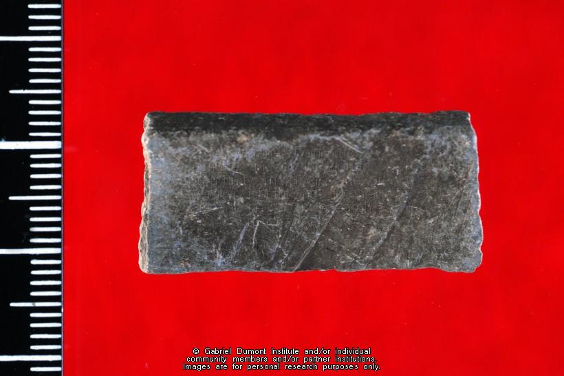 This image (by Peter Beszterda) is of one of five whetstone fragments. They were collected by Dennis and Jean Fisher and their sons in the late 1960s or early 1970s from Batoche. They are part of the Dennis and Jean Fisher Collection. This collection contains archaeological artifacts taken from the battlefields of the 1885 Resistance as well as Fort Pitt (Saskatchewan), Cumberland House (Saskatchewan) and St. Peter’s Mission, Montana. The collection also includes various artifacts and ephemera relating to the 1885 Resistance and Gabriel Dumont. |