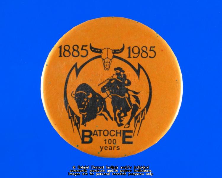 This image (by Peter Beszterda) is of a Batoche centennial button. It is part of the Dennis and Jean Fisher Collection. This collection contains archaeological artifacts taken from the battlefields of the 1885 Resistance as well as Fort Pitt (Saskatchewan), Cumberland House (Saskatchewan) and St. Peter’s Mission, Montana. The collection also includes various artifacts and ephemera relating to the 1885 Resistance and Gabriel Dumont. |