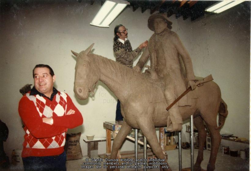 | Description: | In 1984, Saskatoon-based sculptor Bill Epp (brown sweater, pony tail) was commissioned by the Commemorate `85 corporation to sculpt a statue of Gabriel Dumont. In these photographs, Bill Epp (grey sweater) is working on the Gabriel Dumont statue in his workshop in February 1985. Still in plaster, the statue was awaiting casting in bronze at a nearby foundry. The statue was taken to Saskatoon from New Mexico to be unveiled during a special tribute to Gabriel Dumont on May 6, 1985. Later, the statue was taken to the Dumont family reunion at Duck Lake, and was later presented to Saskatoon City Hall on May 14, 1985.