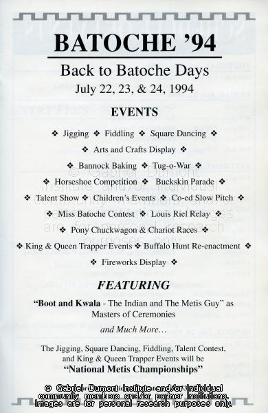 This series of images is a scan of the 1994 Back to Batoche Days program produced by Métis Nation of Saskatchewan. This item was donated to the Institute by Dennis and Jean Fisher in 2011. This collection contains archaeological artifacts taken from the battlefields of the 1885 Resistance as well as Fort Pitt (Saskatchewan), Cumberland House (Saskatchewan) and St. Peter’s Mission, Montana. The collection also includes various artifacts and ephemera relating to the 1885 Resistance and Gabriel Dumont. |