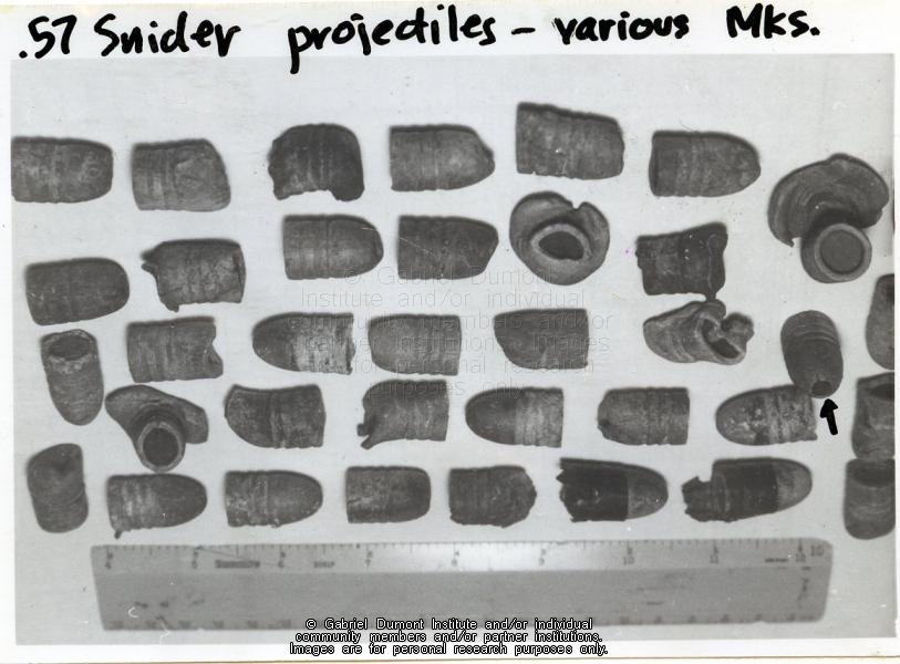 These photographs are of various artifacts, including Gatling Gun shells and Snider rifle rounds and other items found on fields at Batoche by Dennis and Jean Fisher and their sons David, Dennis Jr., and Darwin during the late 1960s and early 1970s. These items were fond before Batoche National Historical Site acquired this land. These photographs are part of the Dennis and Jean Fisher Collection. This collection contains archaeological artifacts taken from the battlefields of the 1885 Resistance as well as Fort Pitt (Saskatchewan), Cumberland House (Saskatchewan) and St. Peter’s Mission, Montana. The collection also includes various artifacts and ephemera relating to the 1885 Resistance and Gabriel Dumont. |