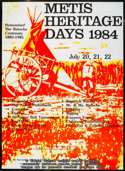 This image is of the 1984 Métis Heritage Days (Back to Batoche Days) poster produced by the Association of Métis and Non-Status Indians of Saskatchewan. This item was donated to the Institute by Dennis and Jean Fisher in 2013. This larger collection, donated in 2011, contains archaeological artifacts taken from the battlefields of the 1885 Resistance as well as Fort Pitt (Saskatchewan), Cumberland House (Saskatchewan) and St. Peter’s Mission, Montana. The collection also includes various artifacts and ephemera relating to the 1885 Resistance and Gabriel Dumont. |