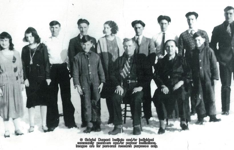 Description: This photograph is of Frédéric and Exerine (née Lejour) Dumont’s family in 1935. Back row, right to left, oldest child to the youngest: Norman Raymond, Eugene Victor, Albert, Evariste Alexandre, Marie Cecile, Lawrence James (father of Mavis Dumont), Samuel Logan, Emma Stella, Mary Theresa. Front row, right to left: William Allen, Marie Zepherine (aka Exerine) Dumont (née Lejour), August, Frédéric. Frédéric was the son of Isadore (Cha-pi-to-la-ta) and Judith (née Parenteau) Dumont. This image was donated by Mavis Dumont
