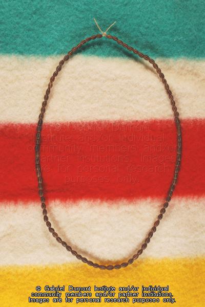 | Description: | This image is of a Wolf Willow Necklace with bison rawhide lacing. This necklace was donated to the Gabriel Dumont Institute by Rick Hayward. |