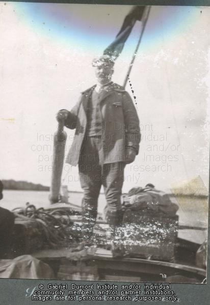 | Description: | Unidentified man on board the Half-Breed Commissioners' York boat, Saskatchewan River NWT, 1900. This image has been graciously provided by the Duck Lake Regional Interpretive Centre for use on this website. It is available for research purposes only. The reproduction of this image in whole or in part is strictly prohibited without the permission of the copyright holder. |
