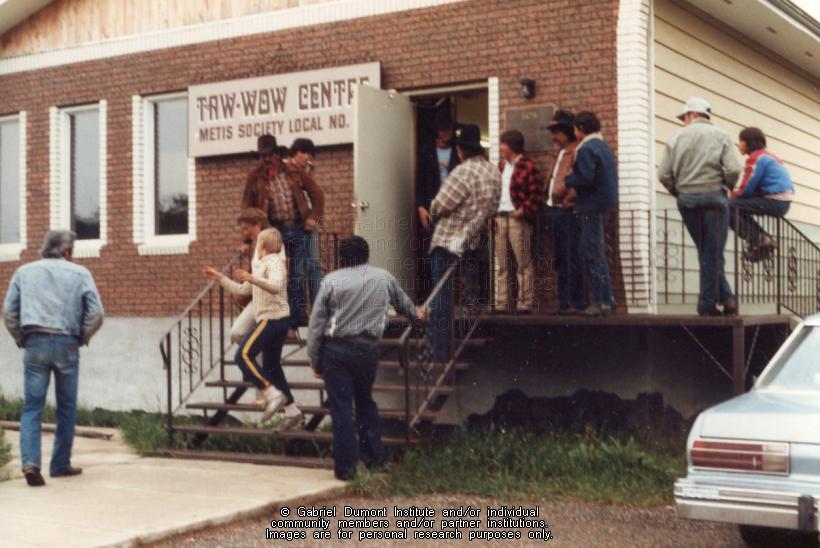 | Description: | Members of the Back to Batoche Alberta Wagon train members at the Duck Lake Métis Centre, "Taw-Waw Centre," Metis Society Local [#10].