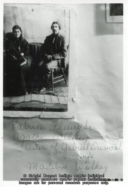 | Description: | Scanned photograph from scrapbook with handwritten caption. Portrait of Patrice Fleury, Sr. and Agathe Wilkey [Wilkie], sister of Gabriel Dumont's wife, Madeline Wilkey [Wilkie].This image has been graciously provided by the Duck Lake Regional Interpretive Centre for use on this website. It is available for research purposes only.The reproduction of this image in whole or in part is strictly prohibited without the permission of the copyright holder. |