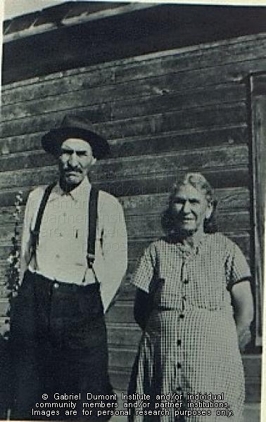This is an image of Isadore Landry (1875–1962) and Octavia Swan (1877–1972) . This image was donated to the Gabriel Dumont Institute by Seneca Landrie. The original source of this image rests with the Landrie family. This image must not be reproduced and can only be used for reference purposes only. |